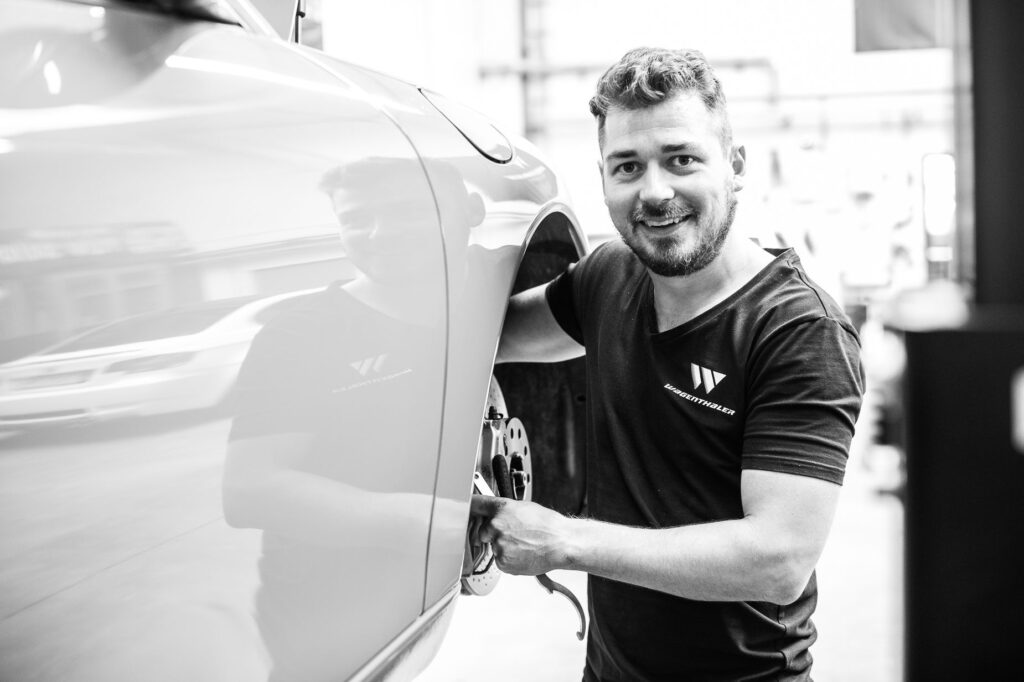 Für Folierung und größere Lackarbeiten arbeiten wir mit geprüften Partnerbetrieben zusammen. Kleinere Lackreparaturen führen wir intern durch. Wir koordinieren alles, von Farbtonabstimmung bis zur Montage und stellen sicher, dass Folie/Lack mit allen anderen Arbeiten kompatibel ist.